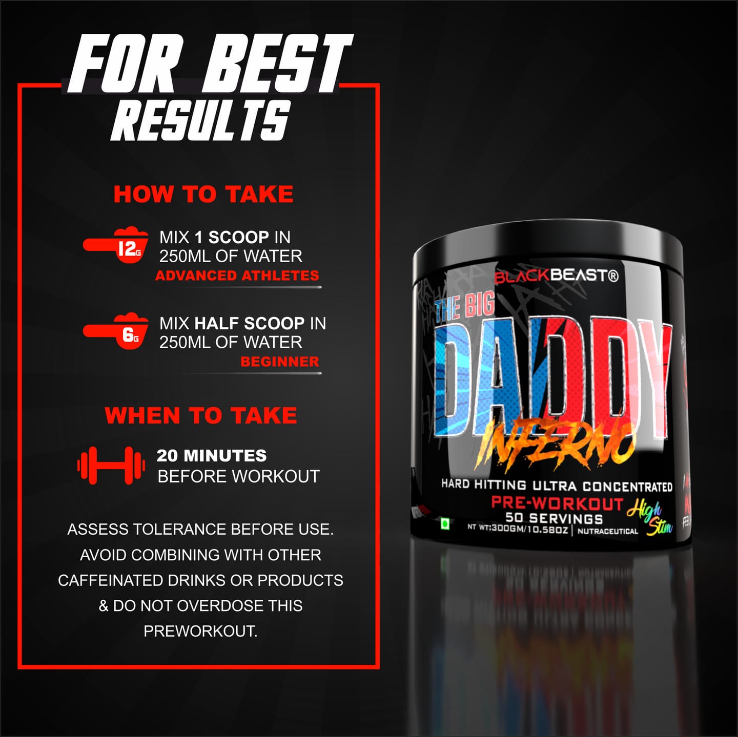 our strongest preworkout formula to date! packed with 12 cutting-edge ingredients, its designed to deliver unparalleled energy, focus, endurance, and power. with scientifically-backed doses for maximum performance, this is the ultimate fuel for pushing your limits. get ready to crush every workout with intensity and insanity! the big daddy inferno preworkout is an absolute monster. loaded with 12 highly potent super concentrated ingredients and high stimulant blend make your new intense pre-workout ready for the battle.